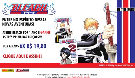 A editora Panini, a mesma que edita o mangá do Naruto e um monte mais de mangás, está agora oferecendo também a opção de assinar o mangá Bleach. E junto com a assinatura a Panini ainda dá um chorrinho na quantidade de mangás da sua assinatura. Assinando você ganha as 3 primeiras edições que já foram lançadas nas bancas.